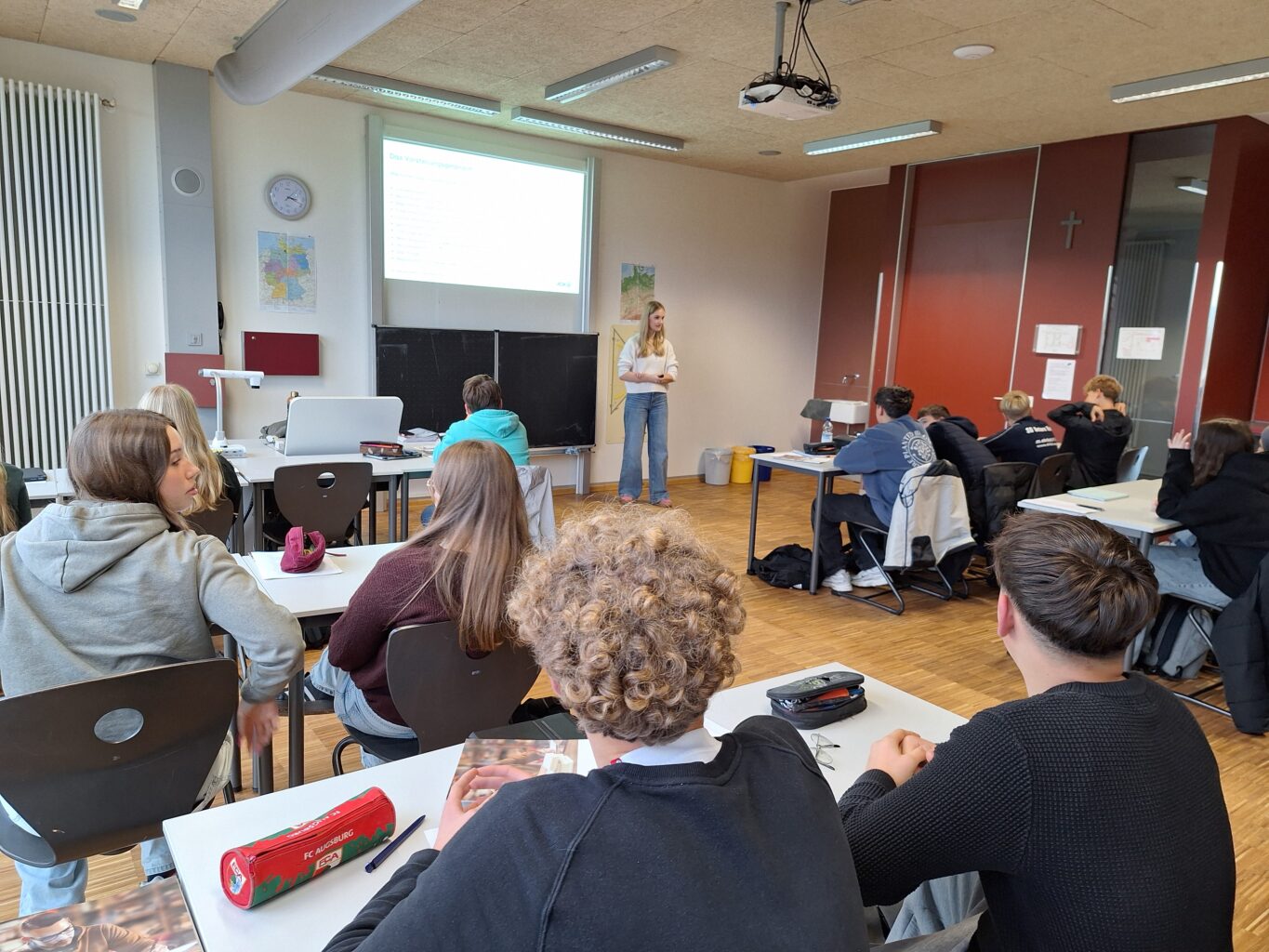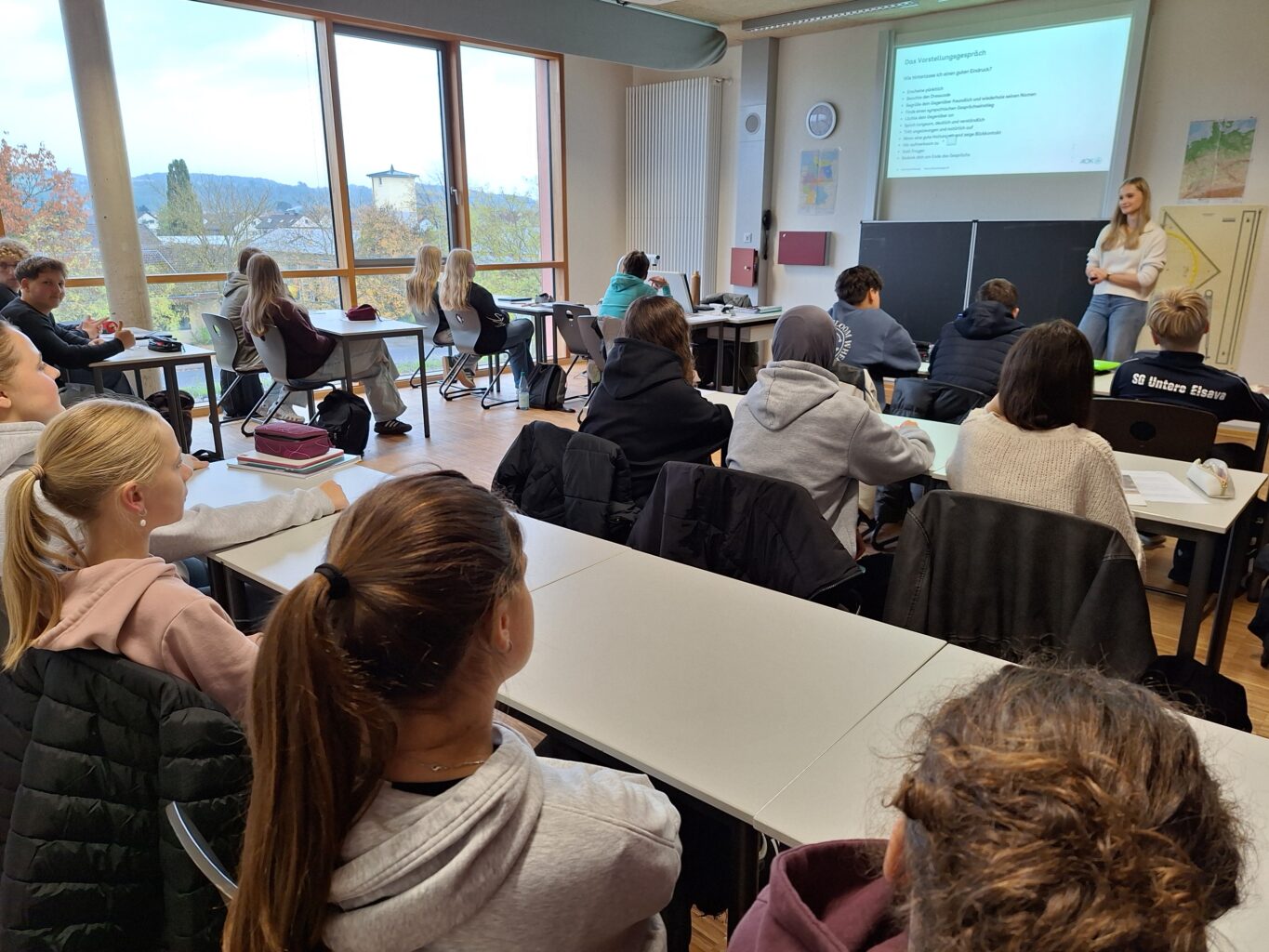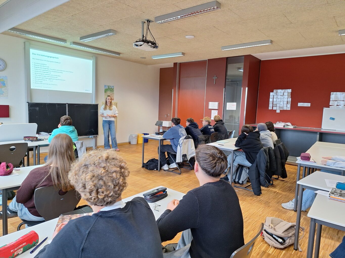 Zwischen dem 20. Oktober und dem 11. November nehmen die vier Klassen in der 9. Jahrgangsstufe das Angebot zum Bewerbungstraining der AOK Bayern wahr. Referentin Noa Peer erklärte dabei, wie den Schülerinnen und Schülern ein guter Start in die Bewerbungsphase und damit auch in die Berufsausbildung gelingt. Dabei zeigte sie den Klassen in den Nachmittagsveranstaltungen auch, wie sie ihre eigenen Stärken betonen sollten. Neben den formalen Bewerbungsanforderungen wies sie auch auf einige Tricks hin, wie man durch die Bewerbung bereits einen Fuß in die Tür zum Beruf erhält. Auch die Relevanz von Schulnoten und speziellen Fächern für verschiedenen Berufsfelder konnte sie anschaulich darlegen. Neben den vielen Informationen hatten die Klassen Gelegenheit und Zeit die Theorie selbst praktisch auszuprobieren. Auch Tipps für die seriöse Online-Bewerbung und das Trainieren der unterschiedlichen Arten der Vorstellungsgespräche und die Einstellungstests gehörten zum Programm. Aufbauend auf das Bewerbungstraining gibt es im Frühjahr 2026 das Assessment-Center-Seminar. Hier werden mit den Schülerinnen und Schülern praxisnah und interaktiv die verschiedenen Übungen und Aufgaben durchlaufen, die über den normalen Bewerbungsprozess hinaus anhand eines Assessment-Centers bei einigen Unternehmen gefordert werden, z. B. Selbstpräsentation, Gruppendiskussion, Rollenspiel und Postkorbübung.