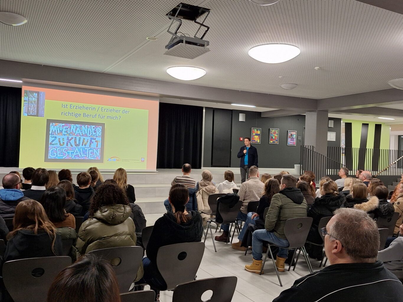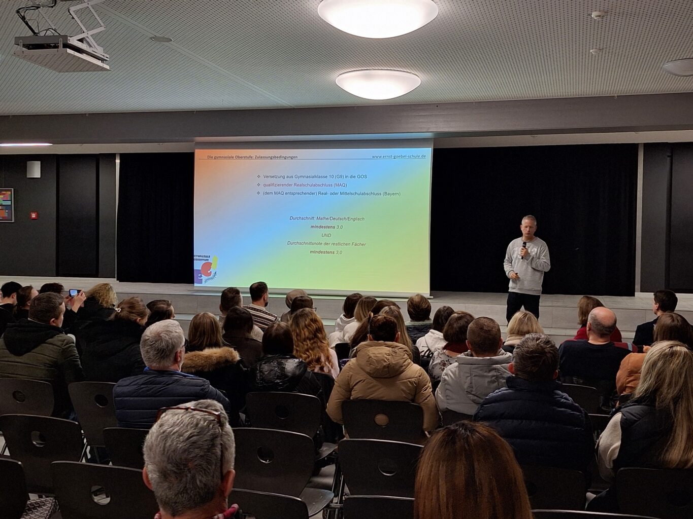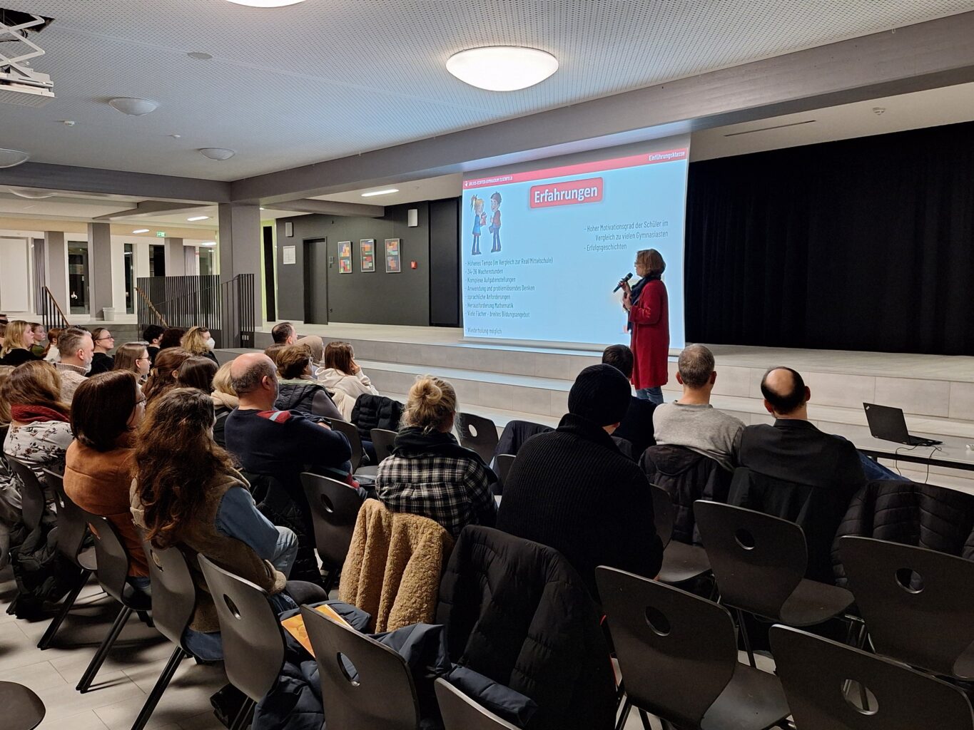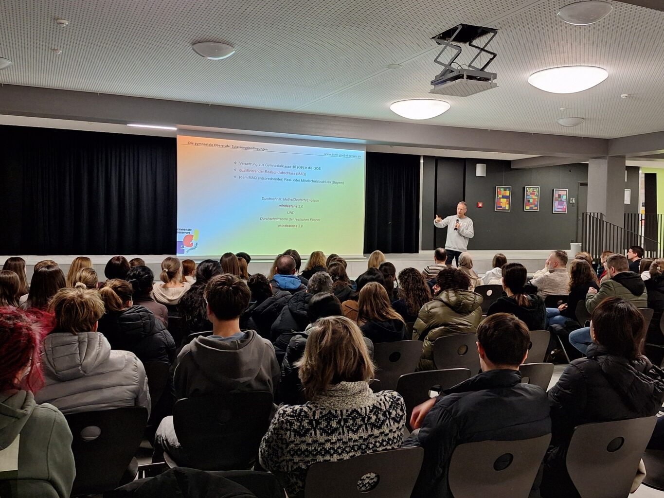 Realschulabschluss – und was dann? Am 19. Januar konnten sich interessierte Schüler*innen aus den 9. und 10. Klassen mit ihren Eltern davon überzeugen, welche vielfältigen Möglichkeiten es neben dem Weg in die Berufsausbildung gibt – insgesamt waren es etwa 150 Besucher. Anfangs informierte Herr Lang von der Fach-/Berufsoberschule Obernburg über die Zugangsvoraussetzungen zur FOS und die Anforderungen dieser Schulart, die natürlich gewisse Zweige der Realschule aufgreift und das Fachabitur zum Ziel hat. Danach stellte Herr Müller die Fachakademie für Sozialpädagogik Aschaffenburg als Berufsfachschule vor und damit die entsprechenden Facetten des Erzieherberufs – eine gute Möglichkeit Beruf und Schulausbildung zu kombinieren. Darüber hinaus konnte Frau Engelbrecht, stellvertretende Leiterin des Julius-Echter-Gymnasiums, den Weg und die Stundentafel für Realschülerinnen in die Einführungsklasse am bayerischen Gymnasium aufzeigen und natürlich den anschließenden Weg zum Abitur darlegen. Den Abschluss übernahm Herr Wehde von der Ernst-Göbel-Schule in Höchst. Er zeigte den Weg der gymnasialen Oberstufe in Hessen auf. Beim anschließenden Austausch stellten die interessierten Zuhörerinnen und Zuhörer Fragen und gingen alle gut informiert nach dem etwa zweistündigen Abend mit neuen Erkenntnissen nach Hause, die bei der Entscheidungsfindung enorm helfen werden. Ein besonderer Dank für die anschauliche und kurzweilige Darstellung gilt allen Referentinnen und Referenten des Abends!